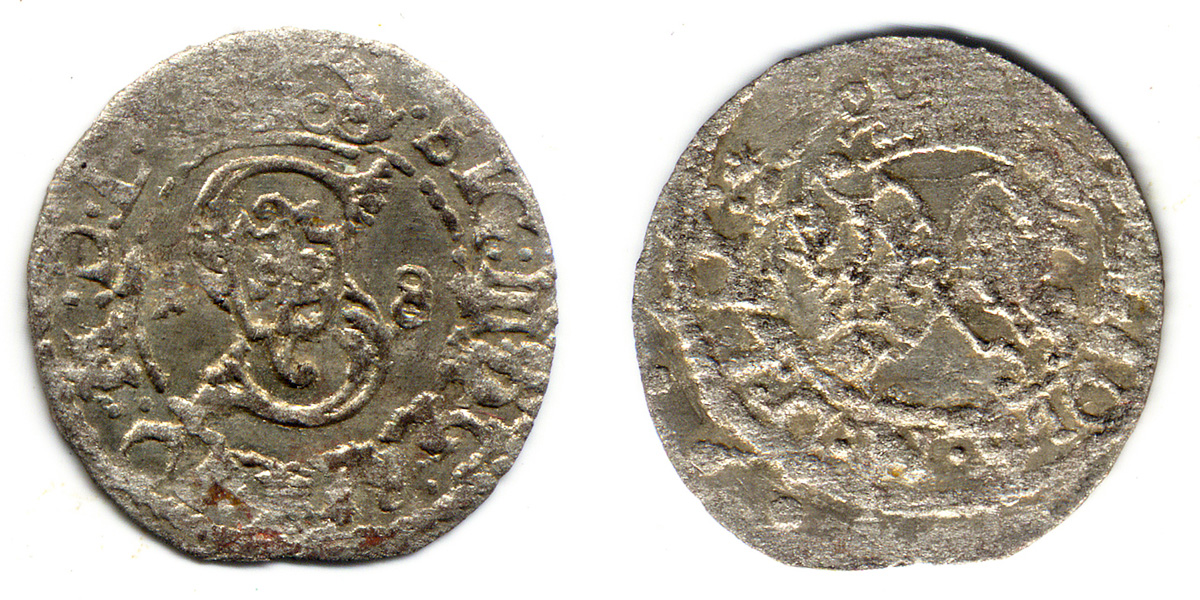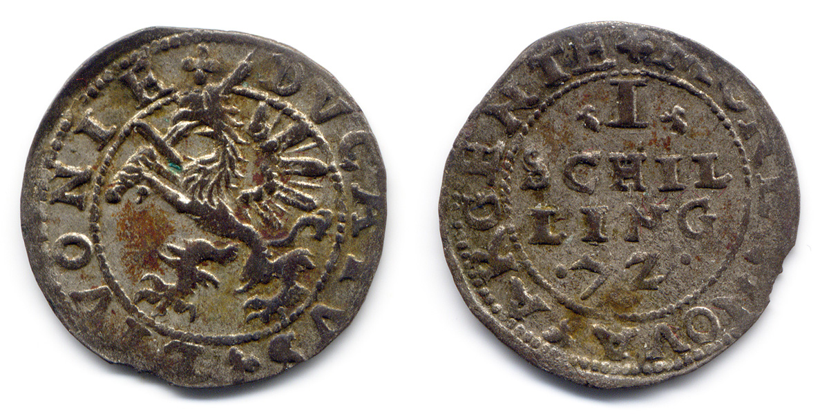 Livonia under Lithuania. Schilling 1572 Dole (Dalholm). Minted by The Great Lithuanian Hetman Jan Karol Chodkiewicz to pay off the mercenaries. Kop. 3111 R3, Haljak II-981a/5a, Fedorov 628, p.238. Variety with cross above and triple leaf below the Griffin. Bil 0,87 g. Scarce condition for this type!