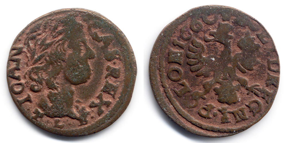 Szelag 1665 TLB. Jan II Kazimierz Waza. Wilno mint. Kop. 3594, Ivanauskas 2013 3JK33-15. Copper 1,46 g. Well minted for this type.