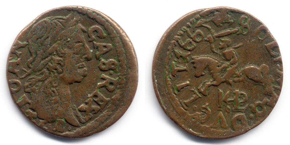 Szelag 1660 TLB. Jan II Kazimierz Waza. Ujazdow mint. Kop. 1546. Copper 1,38 g. Well minted for this type.