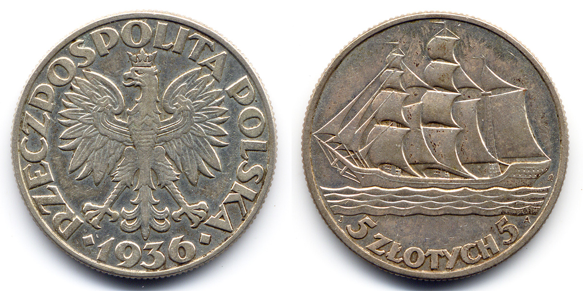 Poland. 5 zloty 1936 'Sailing ship'. Silver 10,88 g. Kopicki 2962. Light patina.