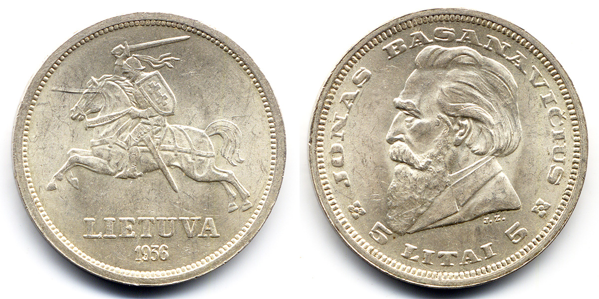 Lithuania. 5 litai 1936 Basanavicius. Silver 5,38 g. Lettered edge. Kopicki 3665. Nearly mint condition. Minting luster