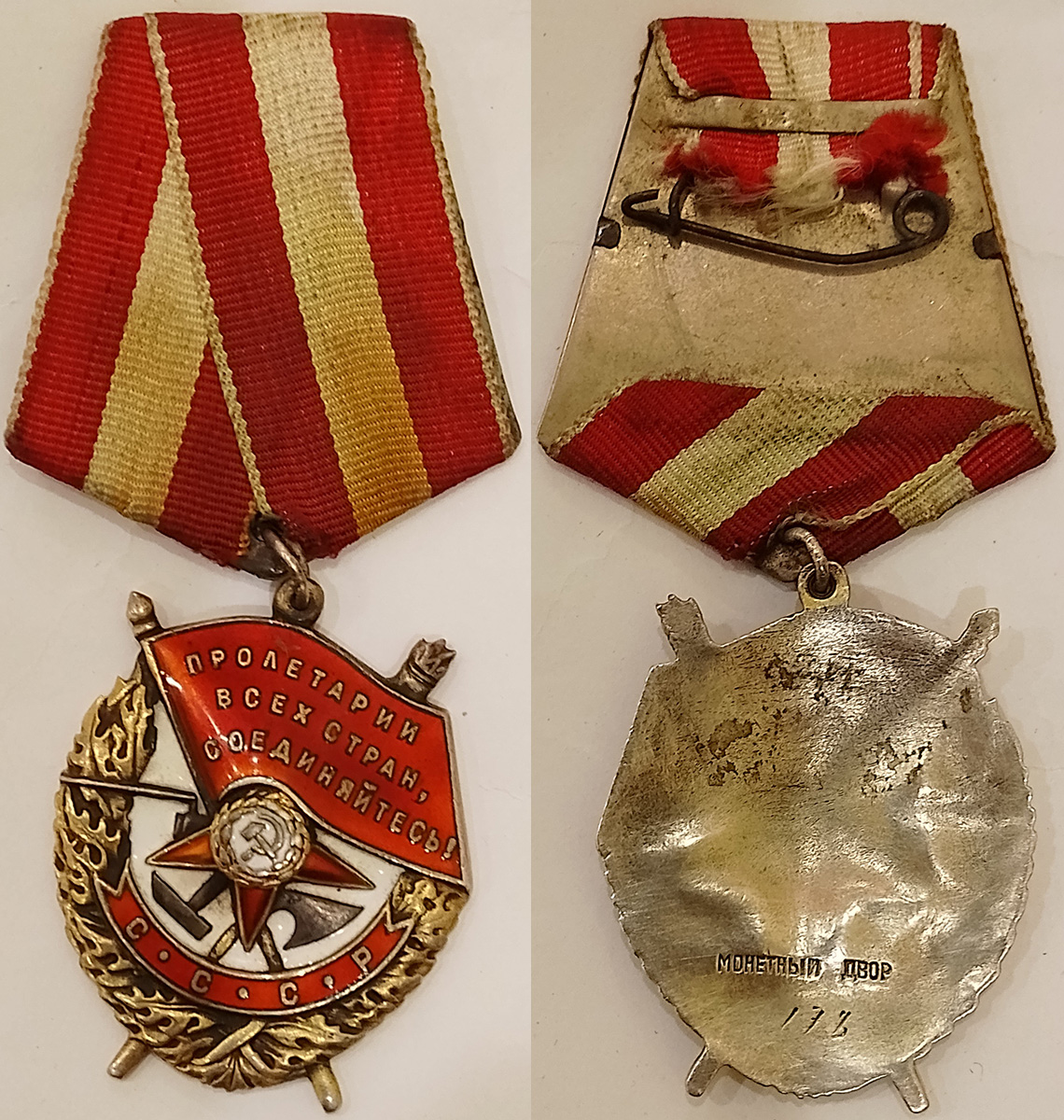 USSR. Order of the Red Banner. Monetny Dvor mintmark in one line. Serial number 178 (hand-engraved). Re-awarded? Five-sided war-time suspension with the original old ribbon.