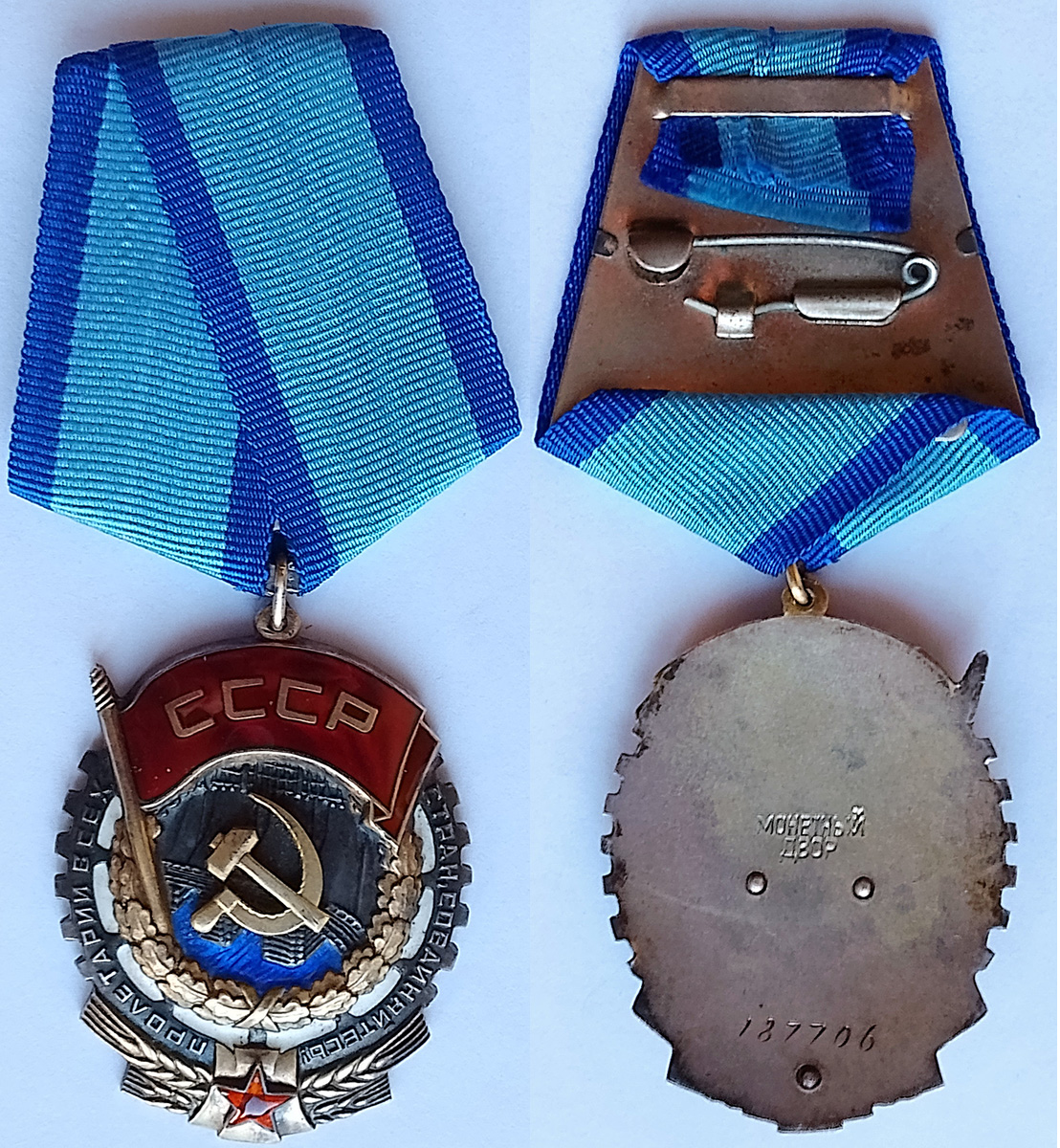 USSR. Order of the Labour Red Banner. Monetny Dvor mintmark in 2 lines in the center above the rivets. 'Semi-long oval' variety. Serial number 187706. Steel five-side suspension with ribbon.