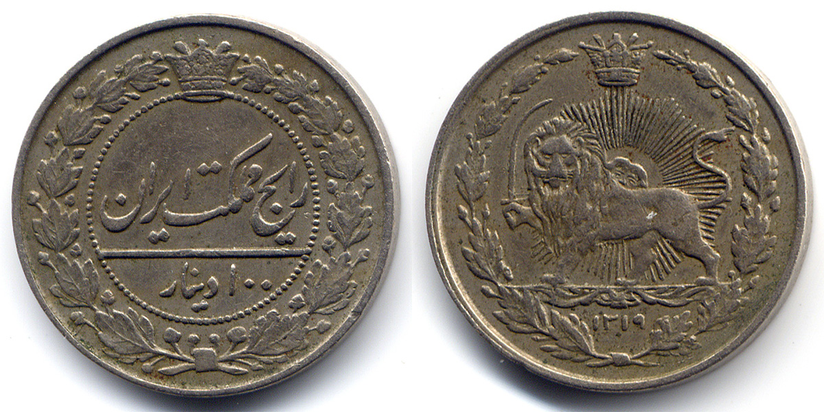 Iran. 100 dinars 1319 (1902). Copper-nickel 4,48 g. KM 962.