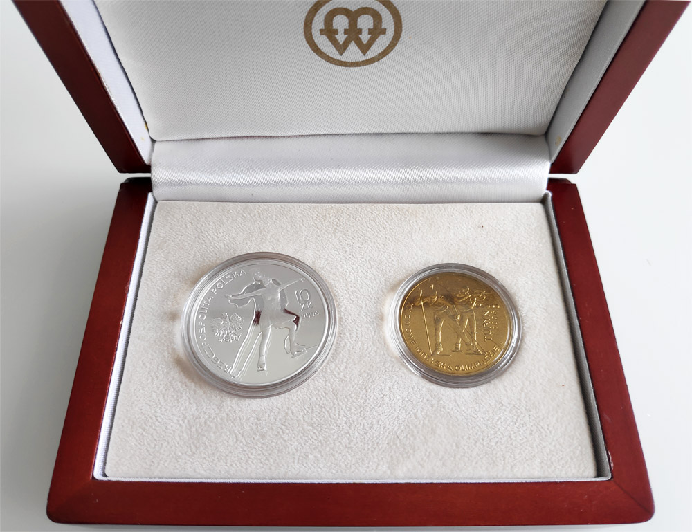 Варшава. 10 злотых - фигурное катание. 2 злотых - биатлон. Оригинальный деревянный футляр на 2 монеты.