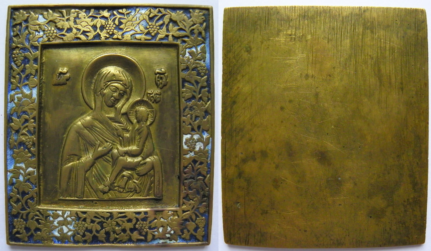 Поясное изображение Богоматери с младенцем на левой руке. На полях - растительный орнамент. Москва, середина XIX в. Бронза, литье, эмаль 2 цветов (синяя и белая). Размер 110 х 95 мм. Состояние - хорошее, небольшие утраты эмали |