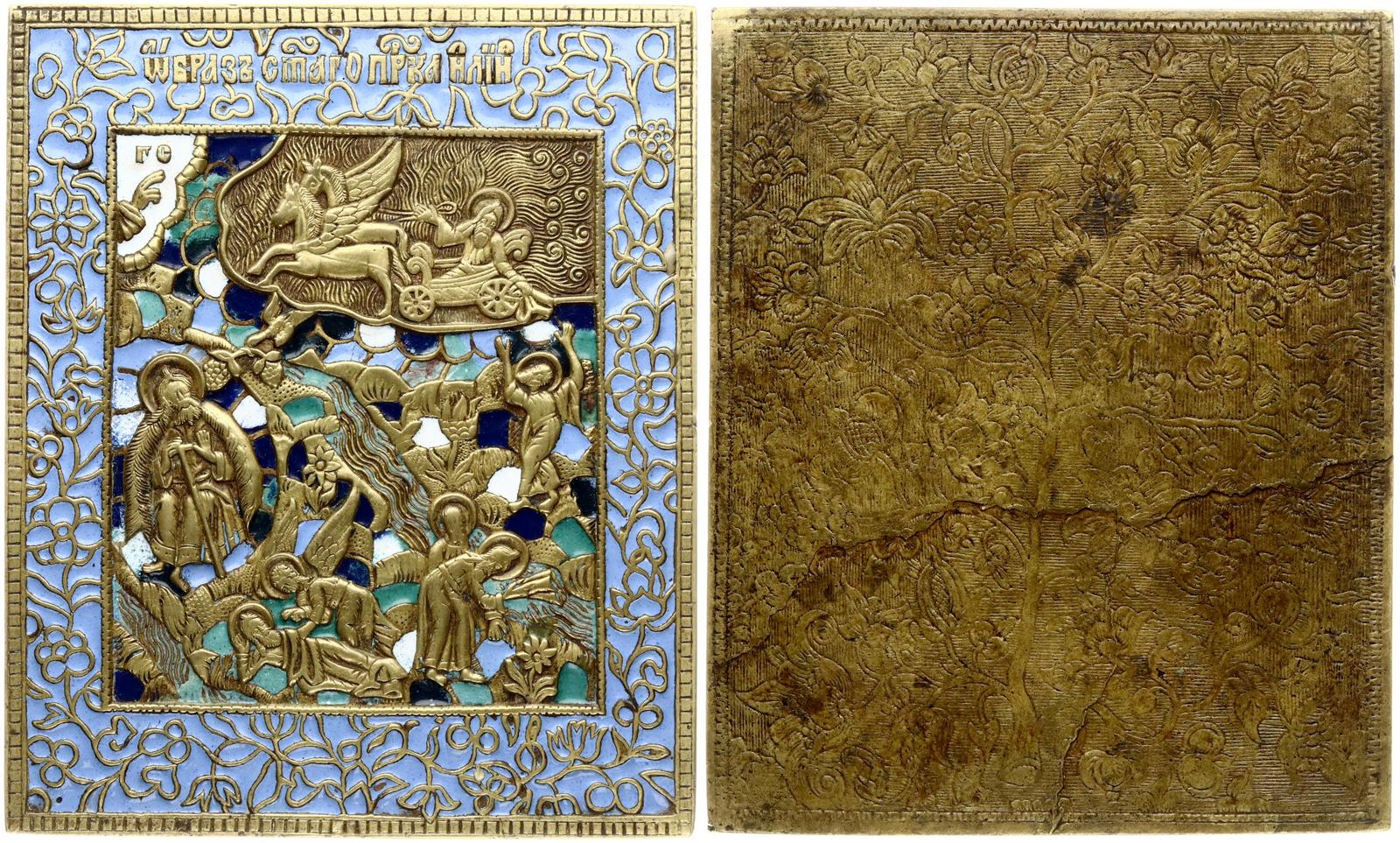 Russia. Icon Fiery ascent of the prophet Elijah with 5-color enamel (blue, white, dark blue, green, black). In the middle, against the background of hills, flowers and a stream, the prophet Elijah sitting in a cave with a staff and a flying raven with a bunch of grapes. Below is the appearance of an angel to the sleeping prophet and Elijah with Elisha on the banks of the Jordan river. At top is the fiery ascension on the chariot of the prophet, facing Elisha, who receives mantle from him. On the left is the blessing right hand. Scaly ornament in the middle and floral ornament on the margins and on the back. Casting defect on the back side. Moscow, end of 19th cent. Casting, copper alloy, 145x120 mm, 496 g..