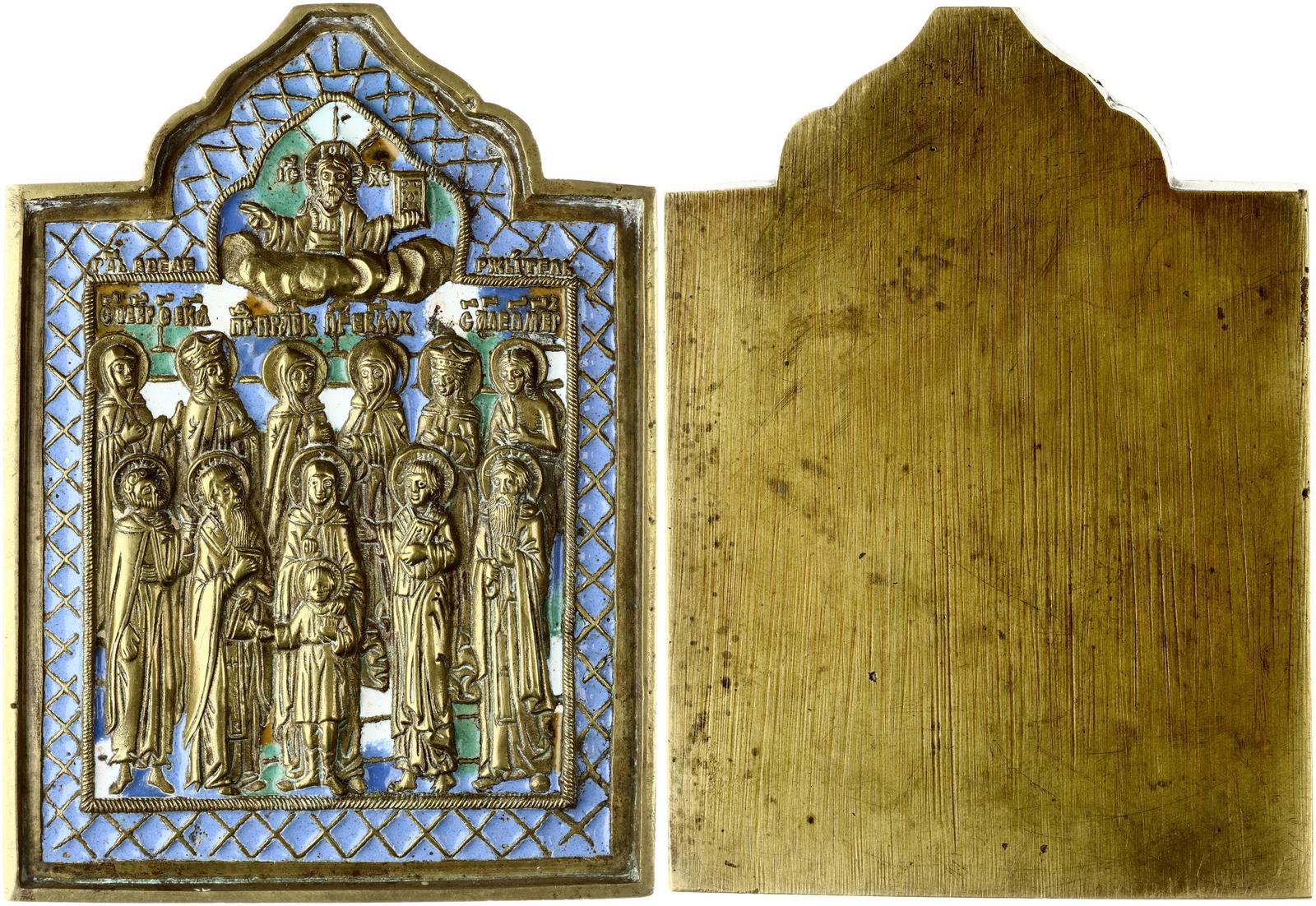 Russia. Icon St. Kirik and Julita and selected Saints with 5-color enamel (blue, dark blue, green, white, yellow). Savior Almighty in the clouds. St. Kirik and Julita below in center. On the left are St. Basil the Great and Prince Peter of Murom, оn the right are Apostle Herodion and St. Paisius the Great. Top left: Princess Fevronia, Great Martyr Catherine, Paraskeva Pyatnitsa. Top right: Great Martyrs Evdokia, Alexandra and Venerable Mary of Egypt. Moscow, end of 19th cent. Casting, copper alloy 128 x 92 mm, 280.20 g..